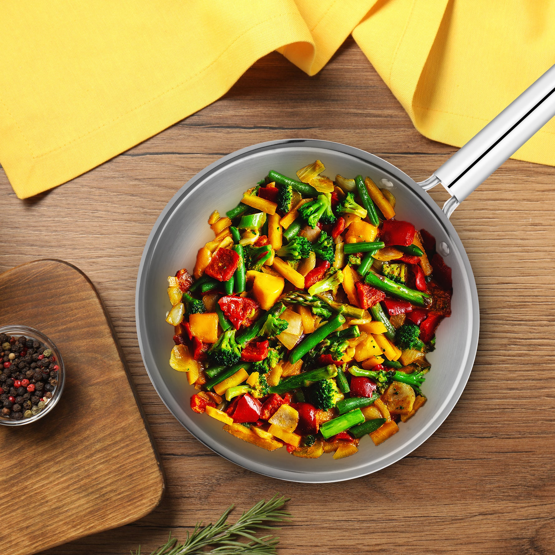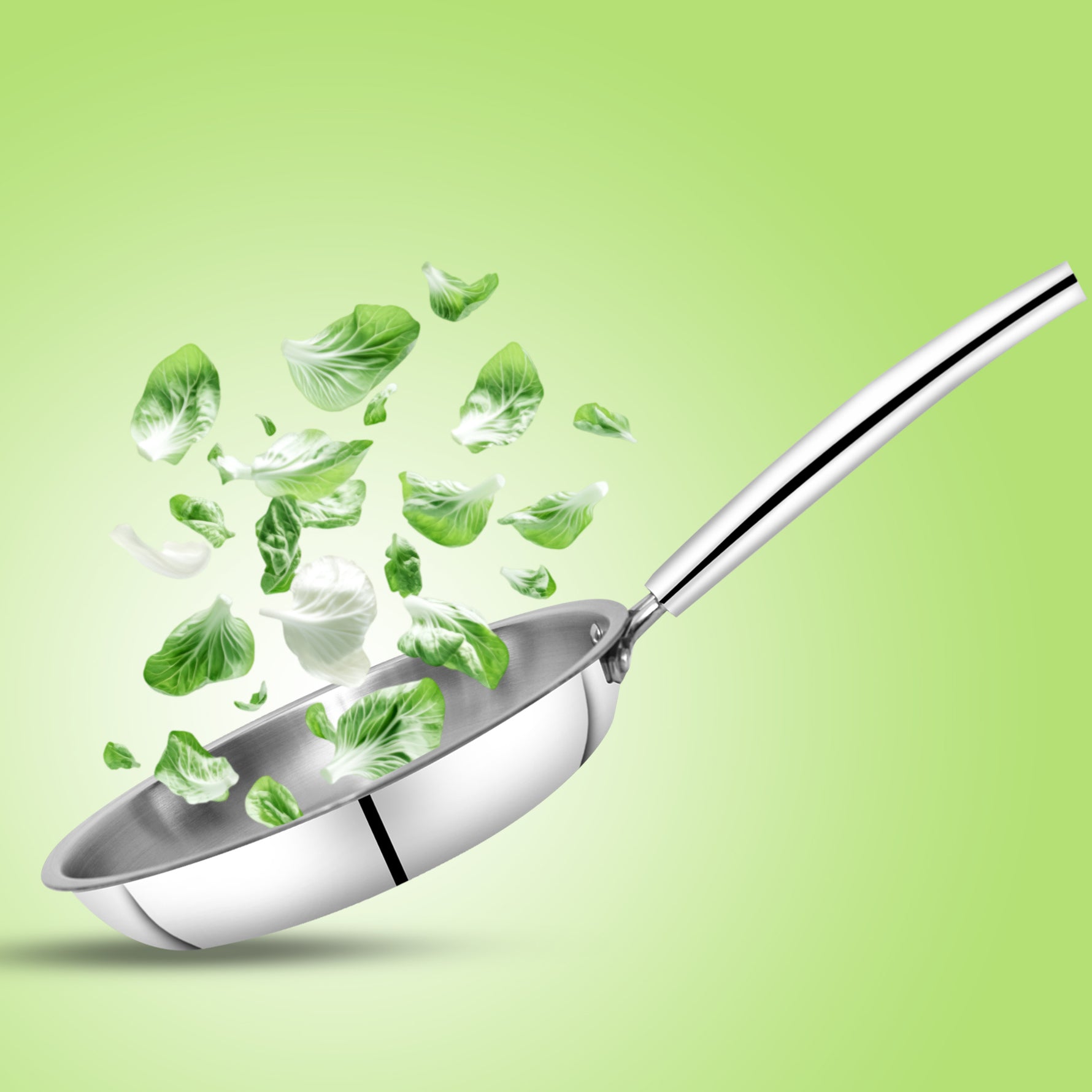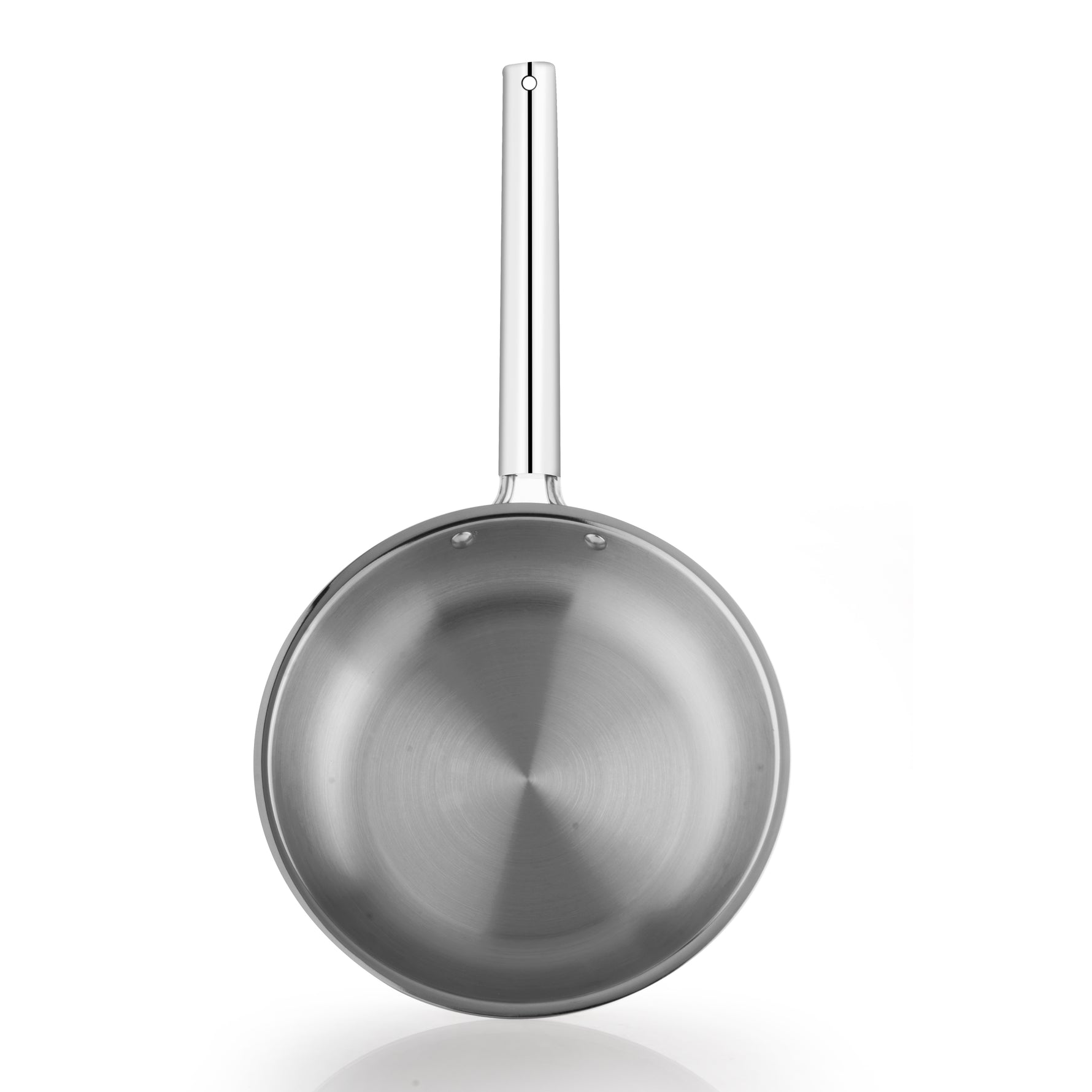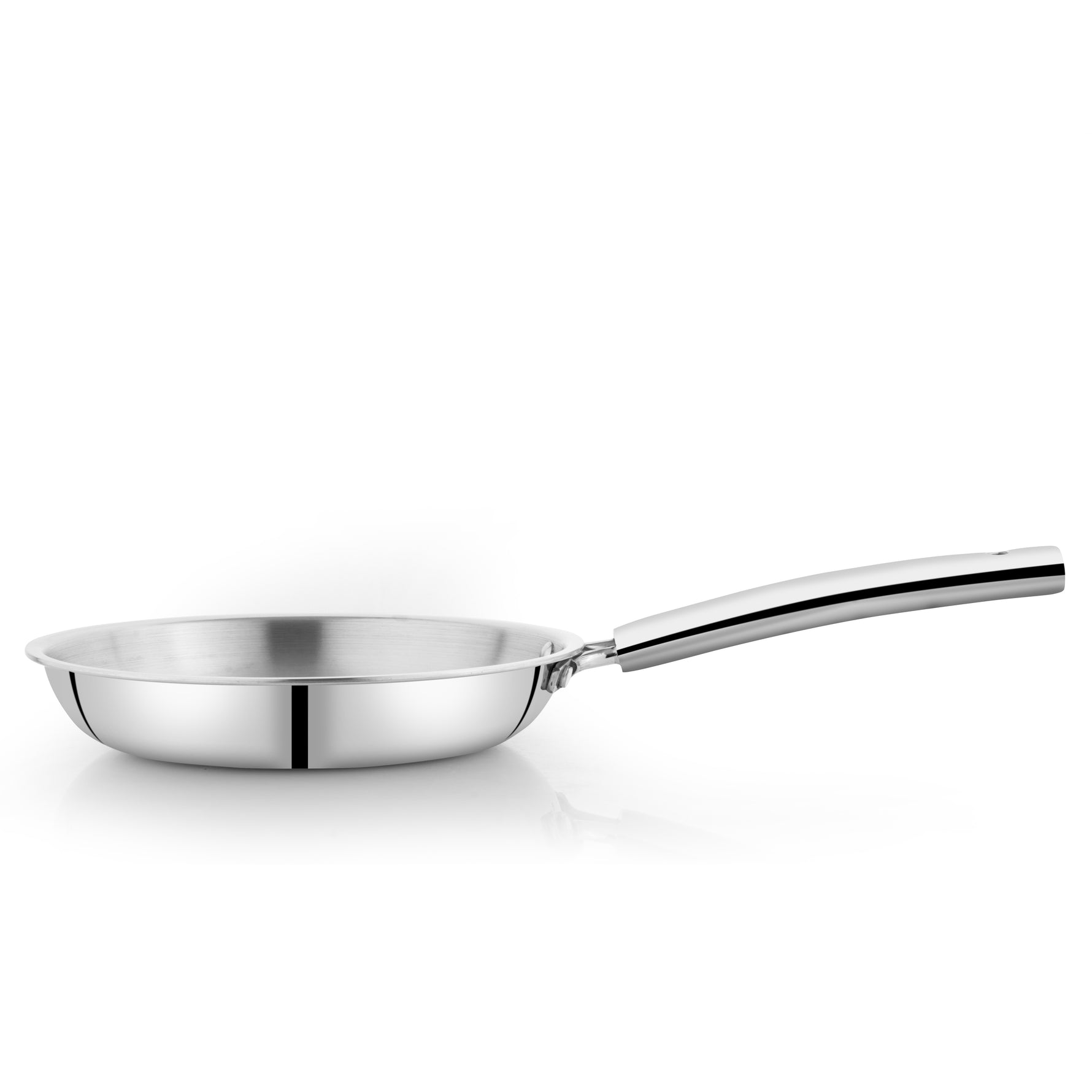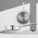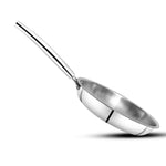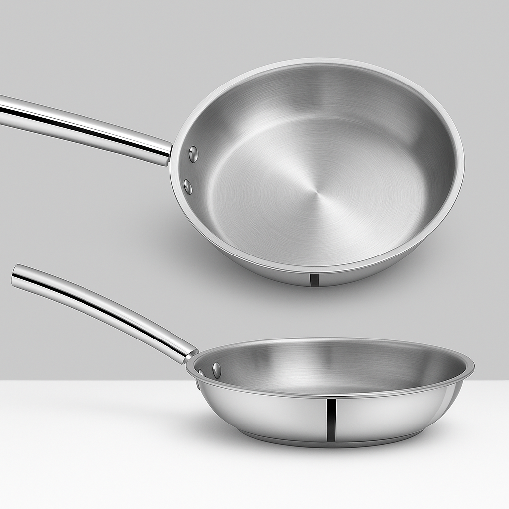 The cooking surface is made from high-quality 18/10 stainless steel with a satin finish, which is highly corrosion-resistant, non-reactive, and completely food safe. This ensures that the frypan does not react with acidic ingredients such as tomatoes, vinegar, or lemon, preserving the natural flavor and nutritional value of your food. The strong stainless steel construction also makes the pan suitable for use with metal utensils without damaging the surface.