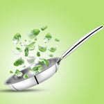 Upgrade your kitchen with the Garuda Triply Frypan, designed for efficient, healthy, and long-lasting cooking performance. This premium triply stainless steel frypan is built using advanced 3-layer bonded construction consisting of 18/10 food-grade stainless steel on the interior, a thick aluminum core in the center, and durable stainless steel on the exterior. The aluminum core ensures rapid and even heat distribution across both the base and side walls, eliminating hotspots and allowing food to cook evenly. This improves cooking efficiency and helps reduce the amount of oil required, making the frypan a healthier alternative to traditional non-stick cookware.