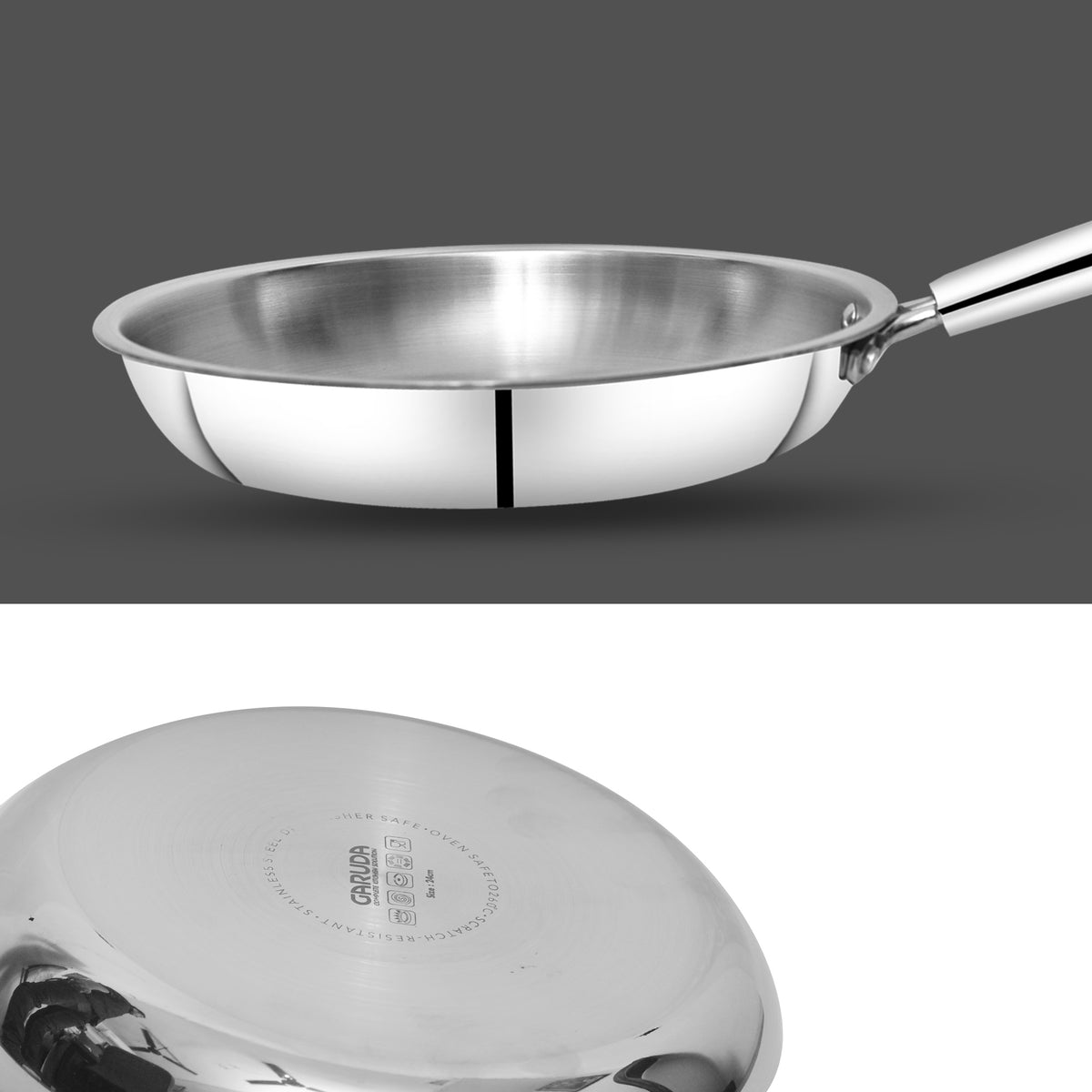 The Garuda Triply Frypan is crafted with premium 18/10 stainless steel and a thick aluminum core for fast, even heat distribution across the base and side walls. This triply stainless steel frypan is induction compatible, oven safe up to 260°C, PFOA-free, dishwasher safe, and ideal for healthy cooking with little to no oil.