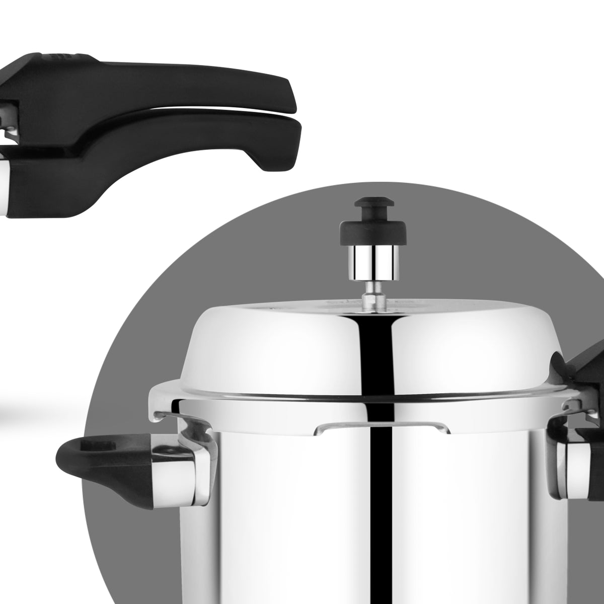 Designed with a straight, sleek body and an outer lid mechanism, this pressure cooker offers easy handling, efficient sealing, and an elegant appearance. Its sturdy handles provide a secure grip, and the well-engineered safety features ensure worry-free use in any kitchen.